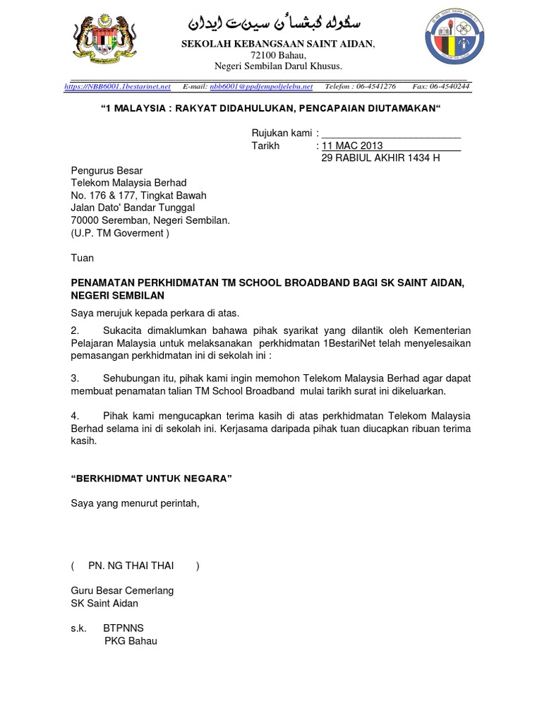 Portalamalaysia tidak ada kaitan dengan government agency atau mana-mana company yang. Contoh surat penamatan perkhidmatan telekom. 7 jalan peserai jaya 1 taman peserai jaya 83000 batu pahat johor darul takzim.
